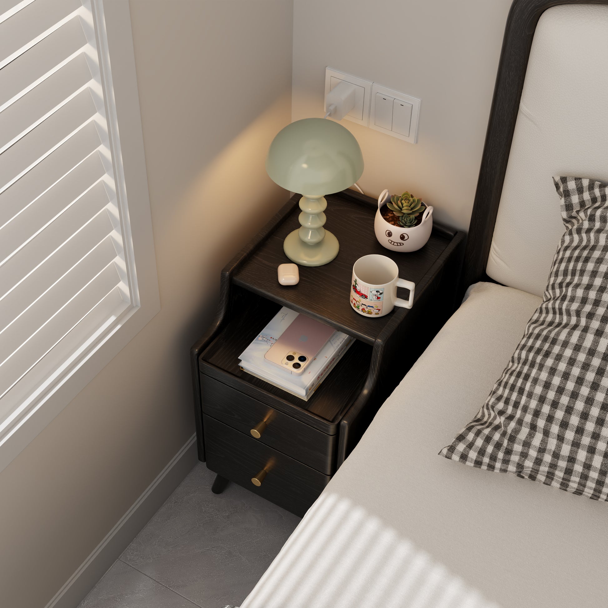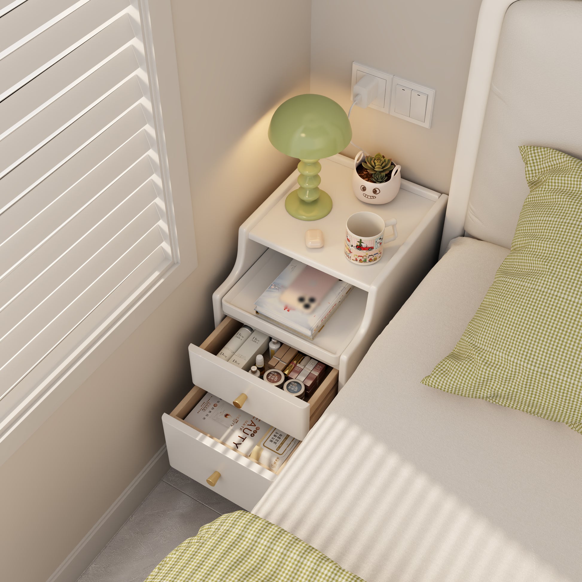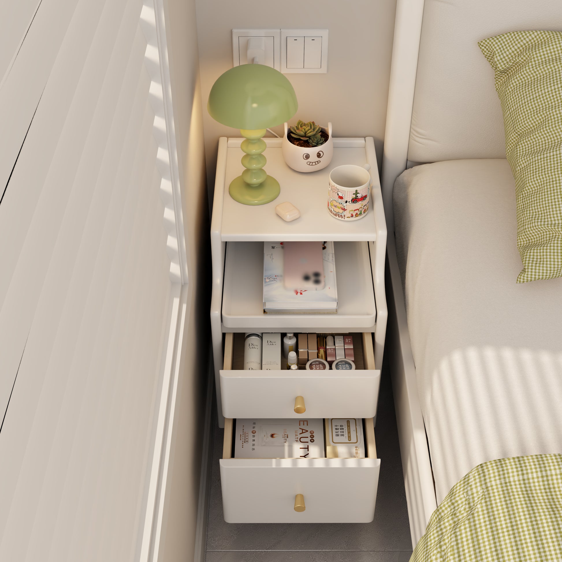 - Various storage spaces: The cabinet and open pull-out drawers can help you store commonly used items such as mobile phones, glasses, book keys, etc. The two closed drawers can help you store items in categories, ensuring privacy and preventing dust.