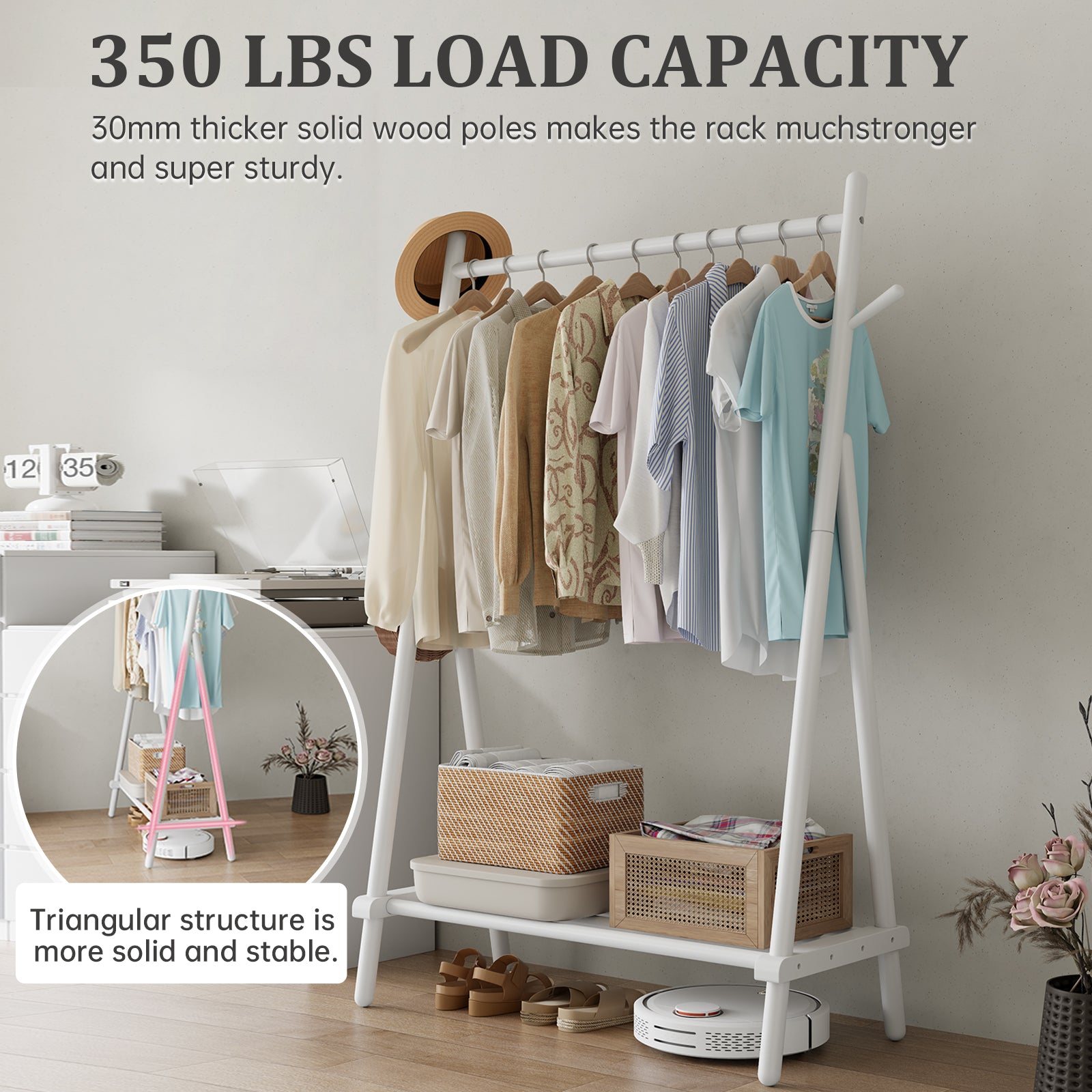 - 【Sturdy and Stable】 Constructed of all solid wood, Heavy-duty garment racks for hanging clothes ensures weight-bearing capacity and is sturdy and not easy to bend. Supports up to 350lbs. And we've eliminated the wheels to improve stability.