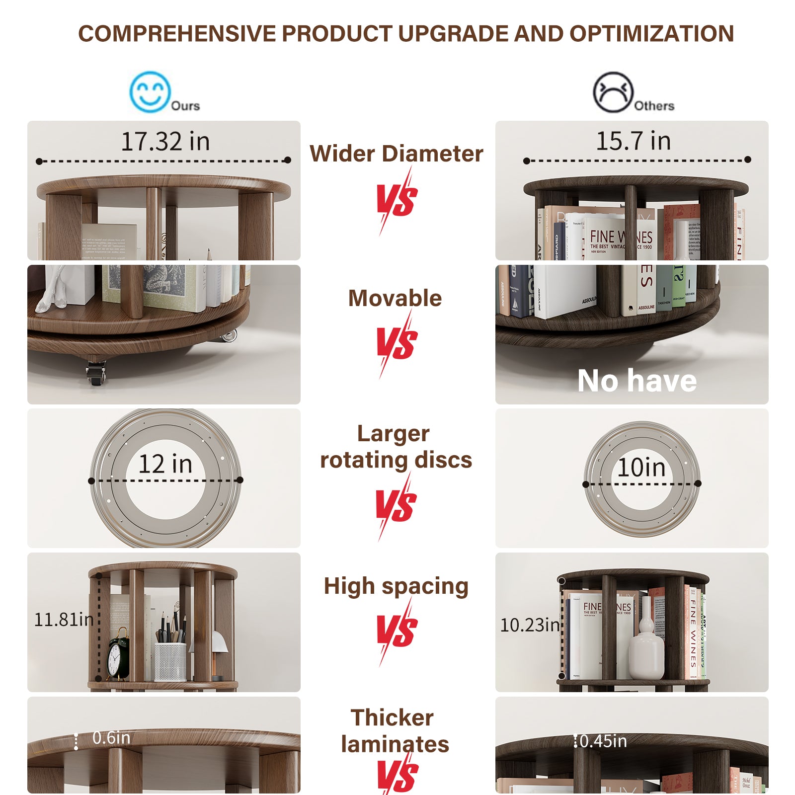 - 【Rotating Bookshelf with Brake Wheels】 We have completely upgraded the rotating bookshelf tower from the previous one. Wider chassis diameter,Larger rotating discs,Wider spacing between layers. As well as the addition of Brake Wheels for easier free movement.