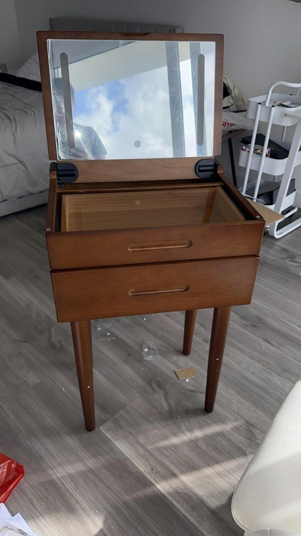 What a wonderful little makeup vanity. I was searching for a very small vanity, and this one is perfect. It was very easy to assemble by simply attaching the legs, and it feels sturdy and well made with solid, heavy wood. The vanity does not include a stool, so I ordered one separately that should arrive in a few days. I cannot wait to start using it. The lighting works beautifully. You can press the button to change the light colors and hold it to adjust the brightness.