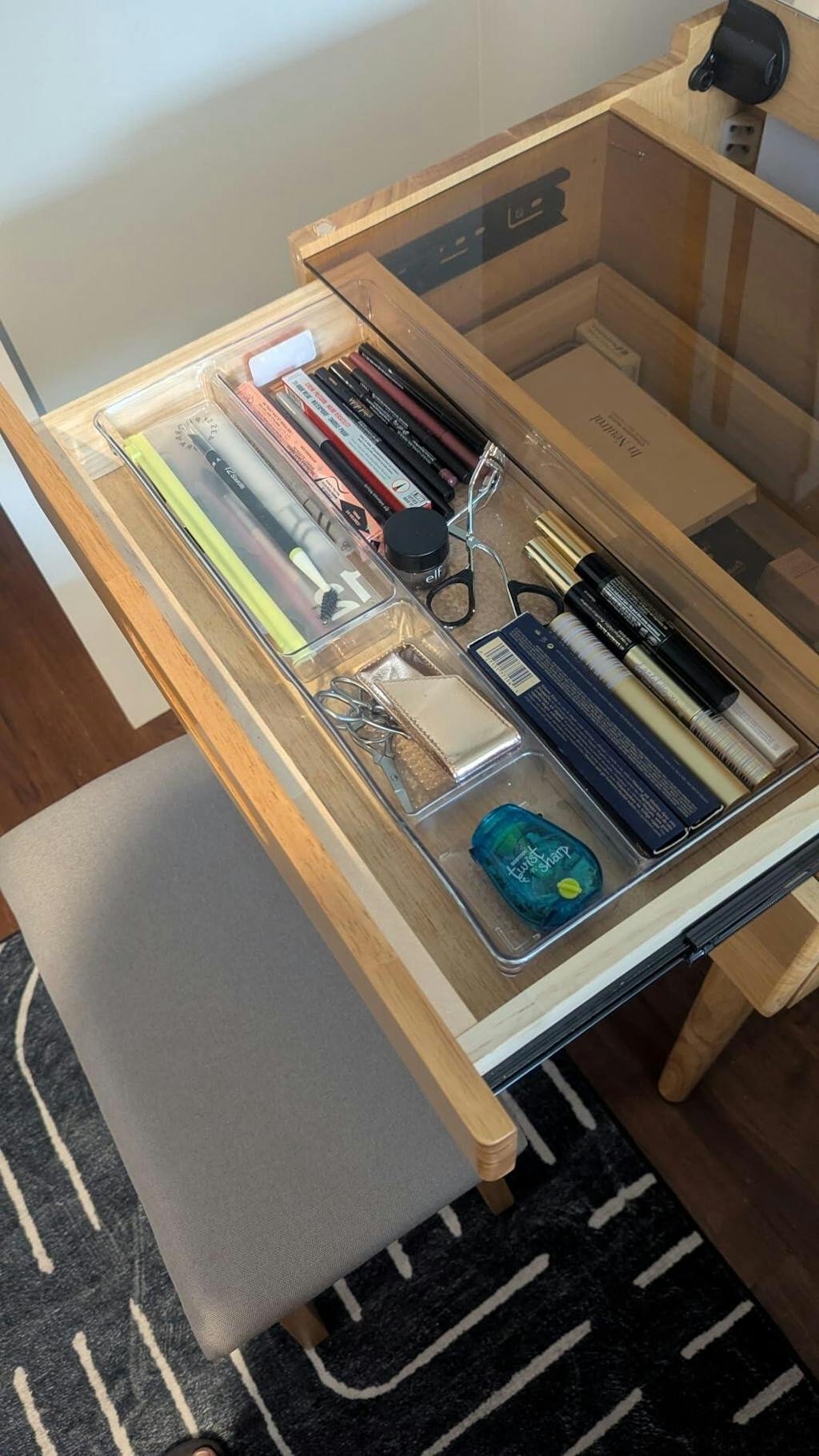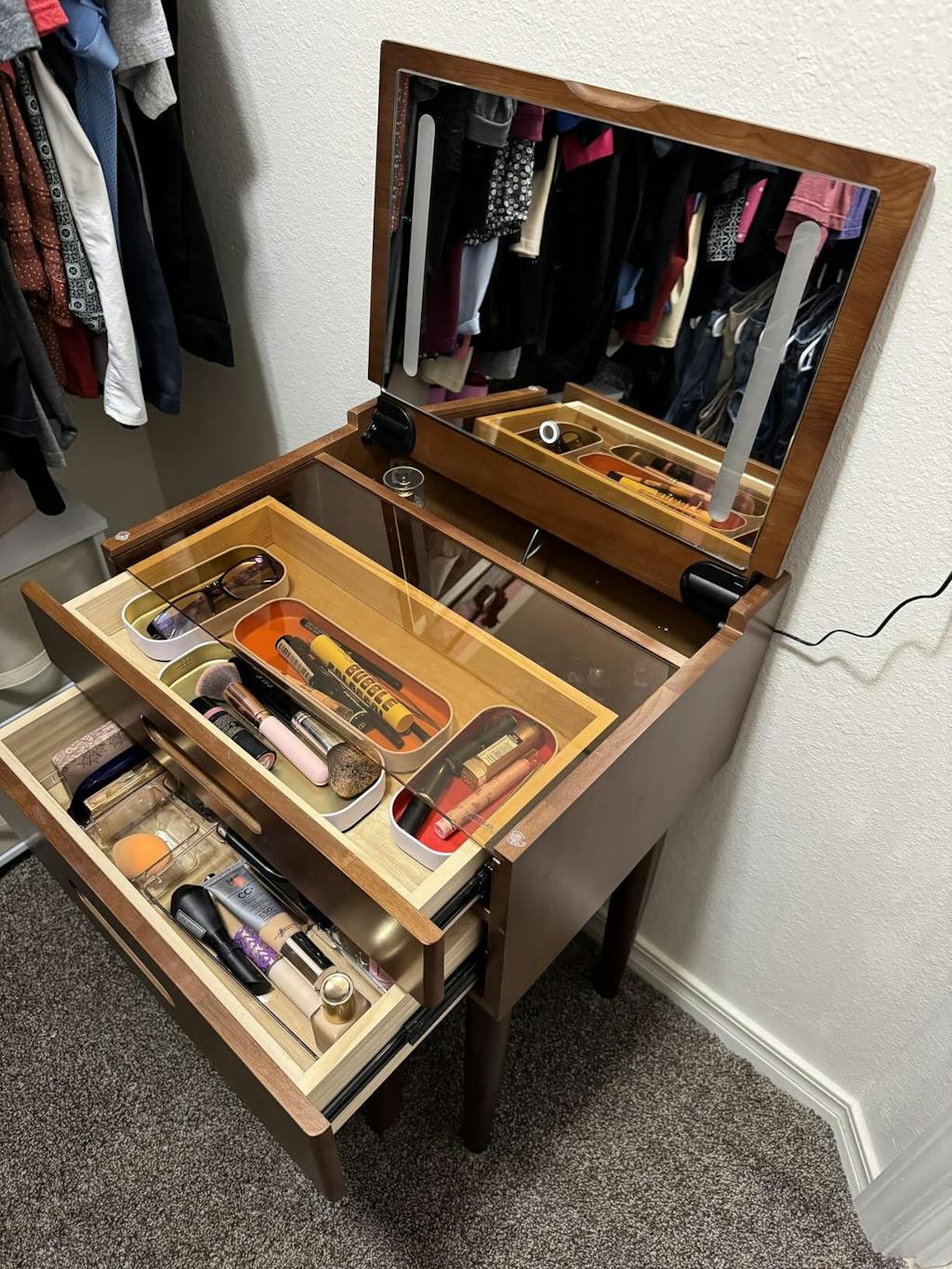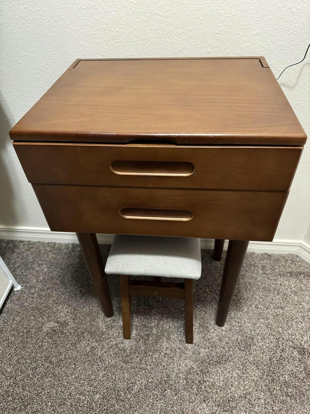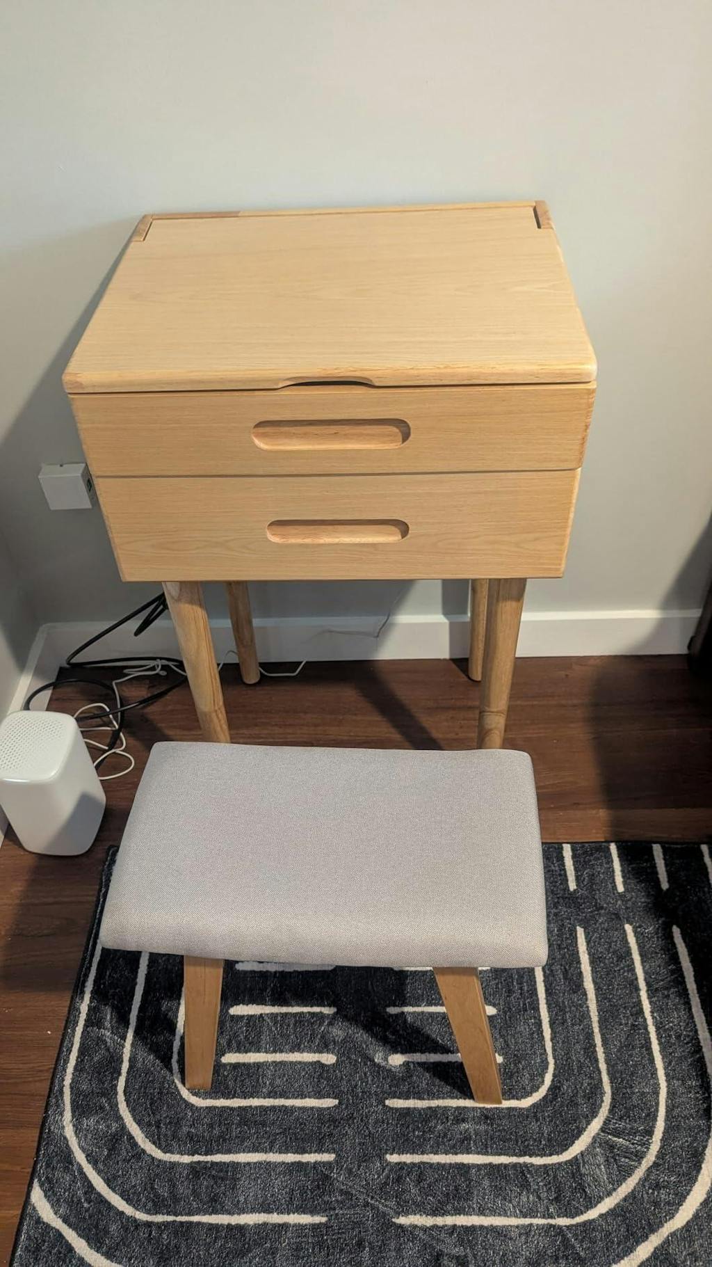 I absolutely love everything about this solid wood small vanity desk! The craftsmanship is excellent. It's sturdy, well-made, and the natural wood grain gives it a beautiful, timeless look. It's the perfect size for a smaller space but still offers enough surface area and storage for all my essentials. The drawers slide smoothly, and the finish is smooth and rich. It feels like a quality piece that will last for years. Assembly was straightforward, and it fits seamlessly with the rest of my decor. Highly recommend if you're looking for something elegant, functional, and compact!