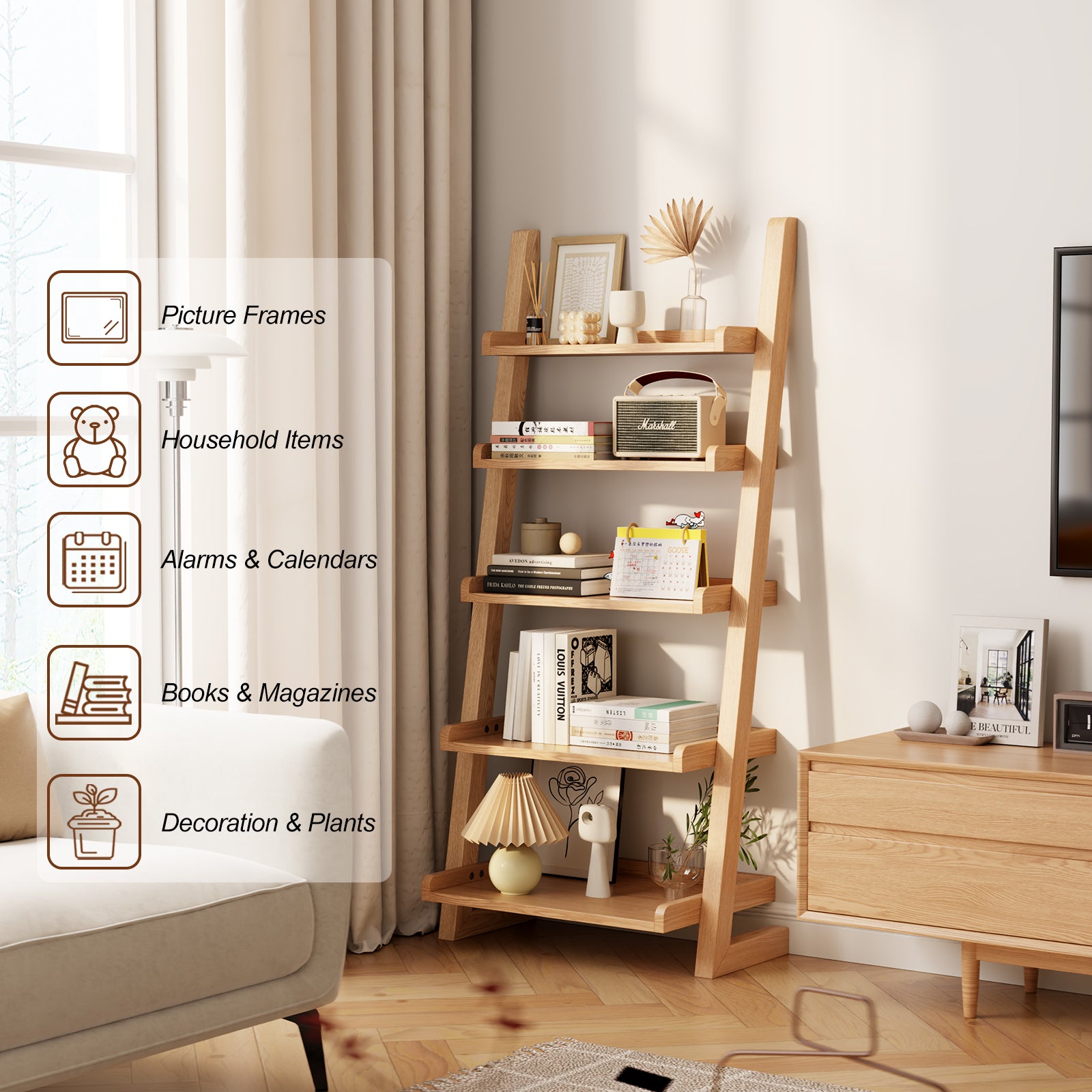 - Large Capacity Ladder Shelf: This 5-tier ladder shelf features a visually layered design with gradually widening shelves from top to bottom, perfect for displaying or storing plants, picture frames, clocks, books, decorations, or everyday essentials. It provides flexible space for you to showcase your personal taste and style.